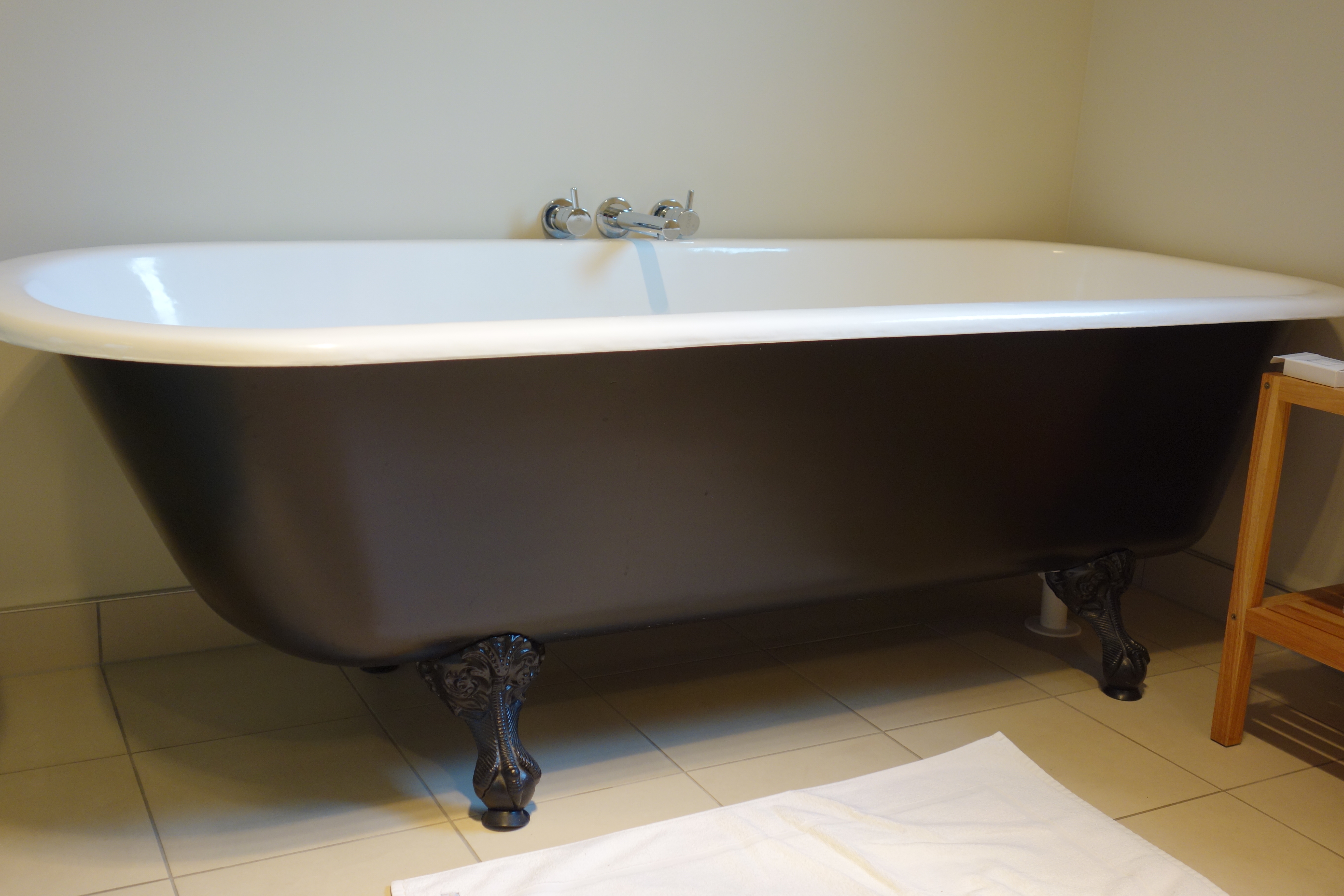 We got the key out of the lockbox and entered our “home” for 2 nights.  It is so adorable.  There is a small kitchen, living room, one bedroom and bathroom.  The bathroom has a claw-foot tub, something that I am already planning for our next house.  The refridgerator had some fresh eggs, butter, cream, and bread.  The glass patio doors open up onto a wooden deck that overlooks the vineyard.